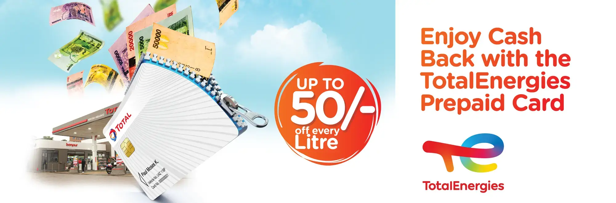 TotalEnergies Learn more UP TO 50/= OFF EVERY LITRE Read More TotalEnergies Prepaid Card Read More TotalEnergies Fleet Card Read More Play Pause Find a Station Promotions TotalEnergies in Uganda Our Products and Services TotalEnergies Card Take Control, Get More! Excellium Fuel Cleans your engine km after km Shop, Food & Services Convenience, Refreshments and More Automotive Lubricants Discover More Motor cycle Lubricants Discover More Industrial Lubricants Discover More Car care Products Discover More Total Solar Discover More Our business Lorem ipsum dolor sit amet, consectetur adipiscing elit. More details Quartz Lorem ipsum dolor sit amet, consectetur adipiscing elit. Discover more Lorem ipsum dolor sit amet, consectetur adipiscing elit.